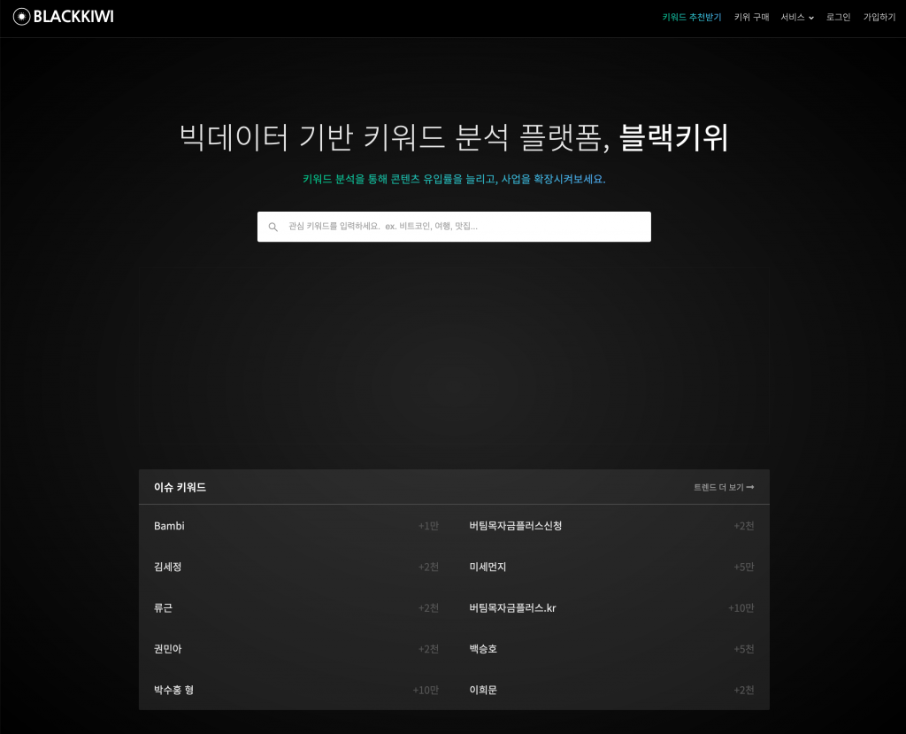 빅데이터 기반 키워드 분석 플랫폼으로 키워드 검색량을 수치로 볼 수 있게 제공하는 것이 특징입니다. 키워드 등급을 표시해서 콘텐츠 상위 노출 관점에서 키워드의 가치를 자체적으로 평가하는데요. 실시간으로 급상승하는 키워드 10개를 +5만, +3만 등으로 실제 검색량을 표시하기 때문에 직관성이 뛰어난 편입니다.