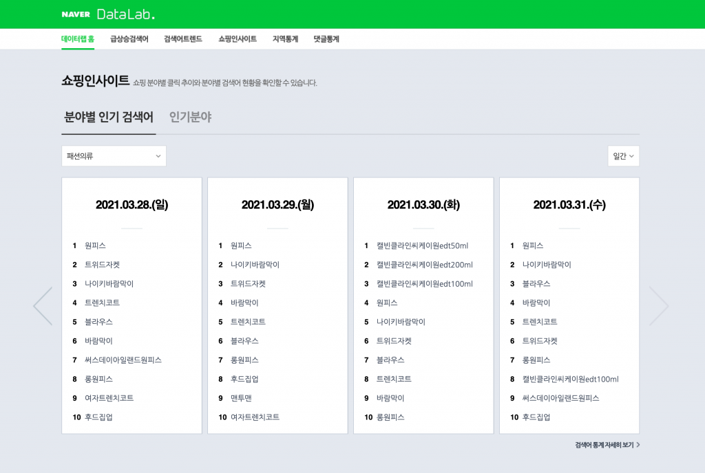 네이버에서 제공하는 한국판 ‘Google Trends’입니다. 사용자들이 네이버에서 검색한 키워드를 기반으로 트렌드를 유추해볼 수 있습니다. 실시간 검색어, 다양한 분야의 인기 검색어를 일간, 주간, 월간 단위로 볼 수 있다는 점이 유용합니다. 특정 키워드를 입력하고 기간, 범위, 연령과 성별을 설정해서 조회할 수 있는데 0에서 100까지 수치를 기준으로 키워드의 트렌드를 파악할 수 있습니다.