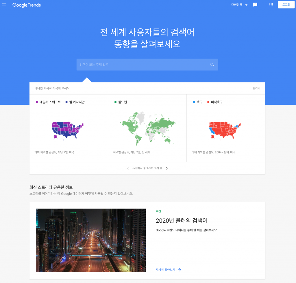 전 세계에서 가장 인기를 얻은 검색어를 지역별로 찾아보고 싶다면 Google Trends