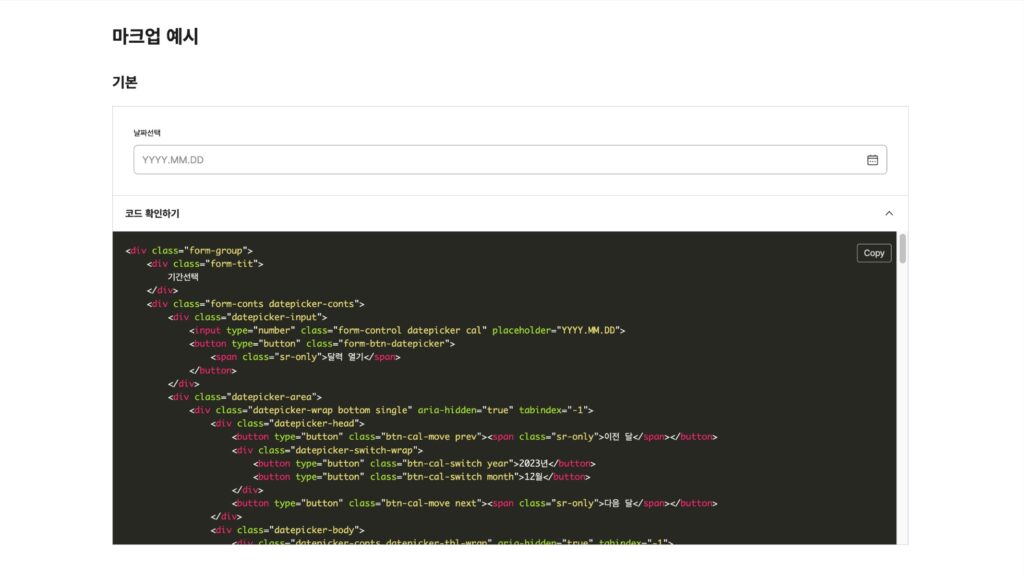 - 컴포넌트 – 사용자 인터페이스의 가장 작은 단위로 과업에 상관 없이 일관성 있게 사용되는 공통 요소에 대한 가이드