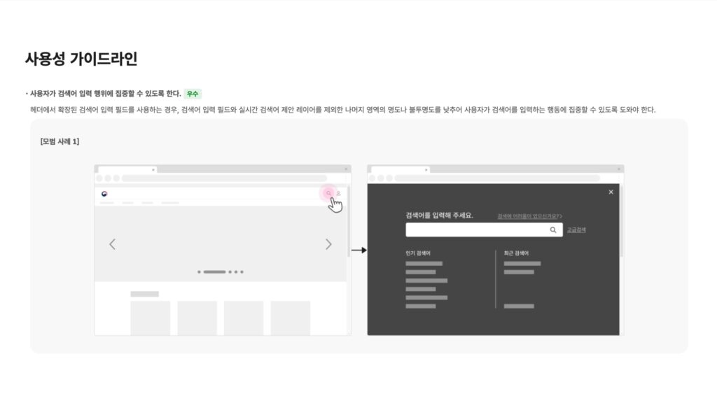 - 구성 요소 및 단일 화면을 넘어 서비스 이용 목적 달성을 위한 사용자 여정을 고려하여 사용자 경험을 향상할 수 있는 구체적인 가이드라인을 제시