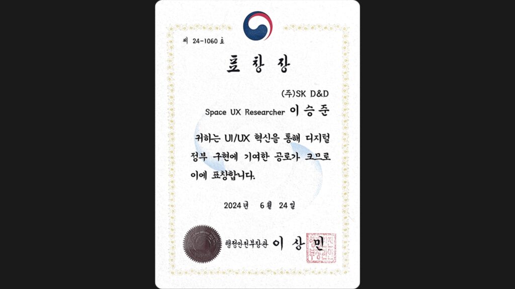 제가 ‘더 나은 도시생활‘을 만들기 위해 오프라인까지 UX 리서치 영역으로 넓히는 과정에서도 ‘더 나은 공공 디자인’을 위해 자문을 해왔던 것은 스스로 1명의 디지털 정부 서비스의 사용자로서 목소리를 더하기 위한 목적이 있었습니다. 선의에 대해 정부로부터 유공을 인정받는다는 것은 일을 하면서 얻을 수 있는 또 다른 큰 자기 효능감입니다.