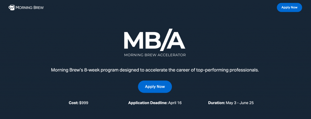 Morning Brew에서 만든 교육 프로그램으로 Morning Brew Accelerator라는 의미입니다. 4월 16일까지 지원자를 모집하고 수업은 5월 3일부터 6월 25일까지 온라인으로 이루어집니다. Morning Brew에서 처음 선보이는 인터넷 강의라고 생각하시면 됩니다.