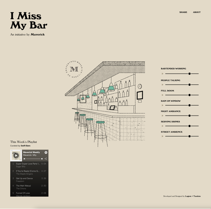 재택근무를 하고 있다면 I Miss My Bar에 접속해보세요. 바에 앉아서 바텐더가 칵테일을 만드는 소리를 들을 수 있어요. 낮술 하고 싶을 때, 비가 오는 바에서 사람들이 이야기하는 소리를 들으면서 군중 속의 고독을 느끼고 싶을 때, 낯선 배경음악을 들으며 “이 노래 뭐지?”라며 Shazam을 켜고 싶을 때 I Miss My Bar에 다녀와도 좋겠네요.