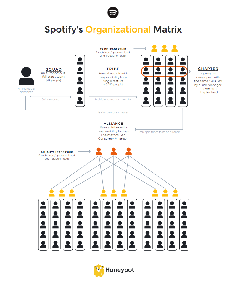 스포티파이 조직을 구성하는 가장 작은 단위는 ‘스쿼드(Squad)’입니다. 하나의 프로젝트를 함께 수행하는 스쿼드에는 여러 직무, 즉 디자이너와 개발자, 기획자 등이 함께 모여 있죠. 스쿼드에는 ‘장’이 없기 때문에 구성원끼리 자율적으로 의사결정을 해서 빠르게 일을 추진할 수 있습니다.