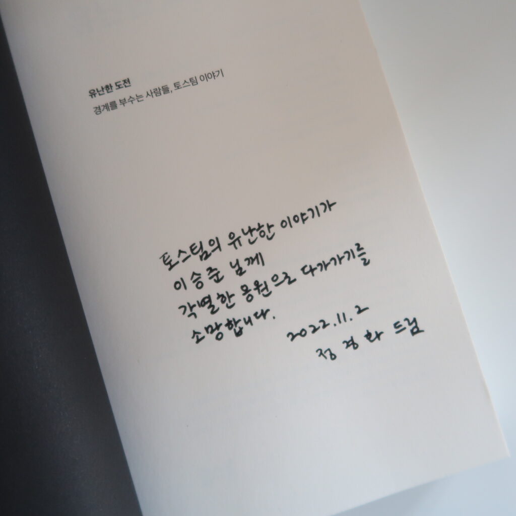 유난한 도전은 나보다 더 뛰어난 사람들이 치열하게 일했고, 가끔 행복한 결과도 있었지만, 그 결말이 아직 다 나오지 않은 상황이라 긴장한 상태로 에너지를 써야만 페이지를 넘길 수 있었습니다. 지극히 사실적이고, 토스팀이었고 토스팀인 사람들의 이야기가 속기록처럼 담겨있는 이야기. 금융부터 바꾼다는 그들의 말처럼, 그다음은 통신, 모빌리티까지 선을 새로 그은 시점입니다. 유난스러운 도전은 지금도 면을 늘리고 있습니다.