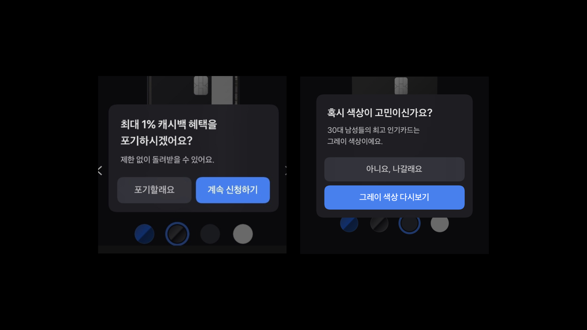사용자가 합리적으로 판단한 결과인데 마치 의지가 없어서 그만둔다는 느낌을 자아내는 ‘취소’ 버튼. 명확한 의도가 있기 때문에 ‘취소’ 혹은 ‘돌아가기’ 대신 ‘포기할래요’라는 UX Writing을 사용했을 겁니다. 이런게 무리수입니다. 이 버튼 덕에 혁신의 상징이라 불리던 플랫폼은 “누가 만든거야?”라는 의문을 자아냈고 만든 사람들이 ‘실력이 없다’라는 일부 인식까지 생겼습니다.