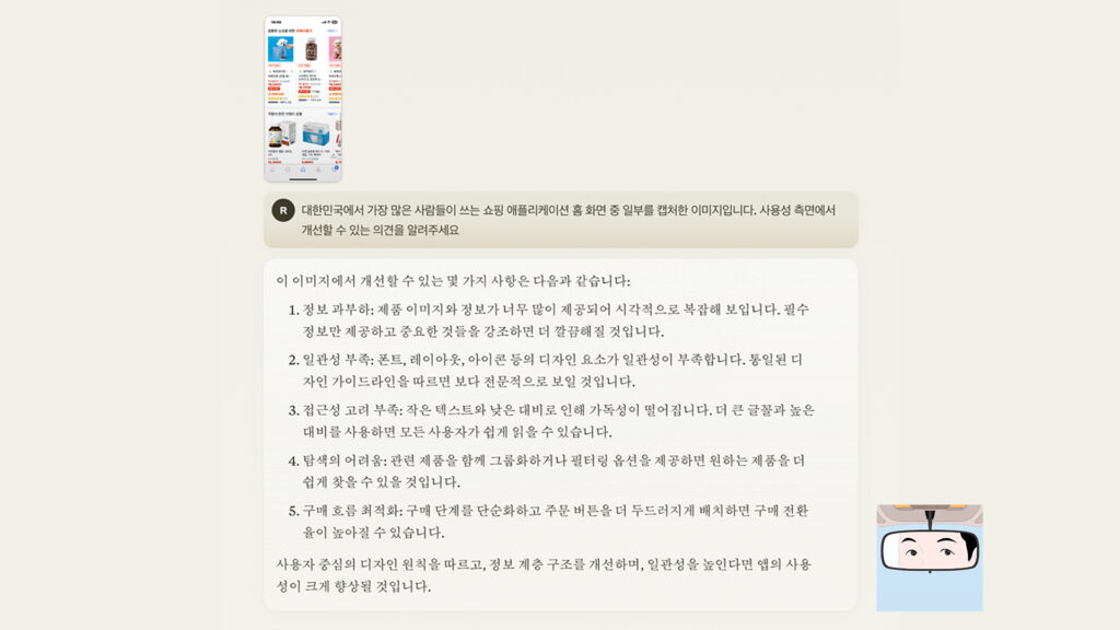 AI가 할 수 있는 것과 없는 것에 대한 명확한 판단과 인식이 필요합니다. 마치 UX 리서치로 할 수 있는 것과 할 수 없는 것을 구분하는 것처럼 말이죠. 이미지 1장을 입력하고 휴리스틱 기반으로 예상되는 사용성 문제를 UT 없이 분석하도록 할 수도 있습니다. 그러나 이 결과물을 확신하느냐의 문제는 여전히 UX 리서처의 역할이 될 겁니다.